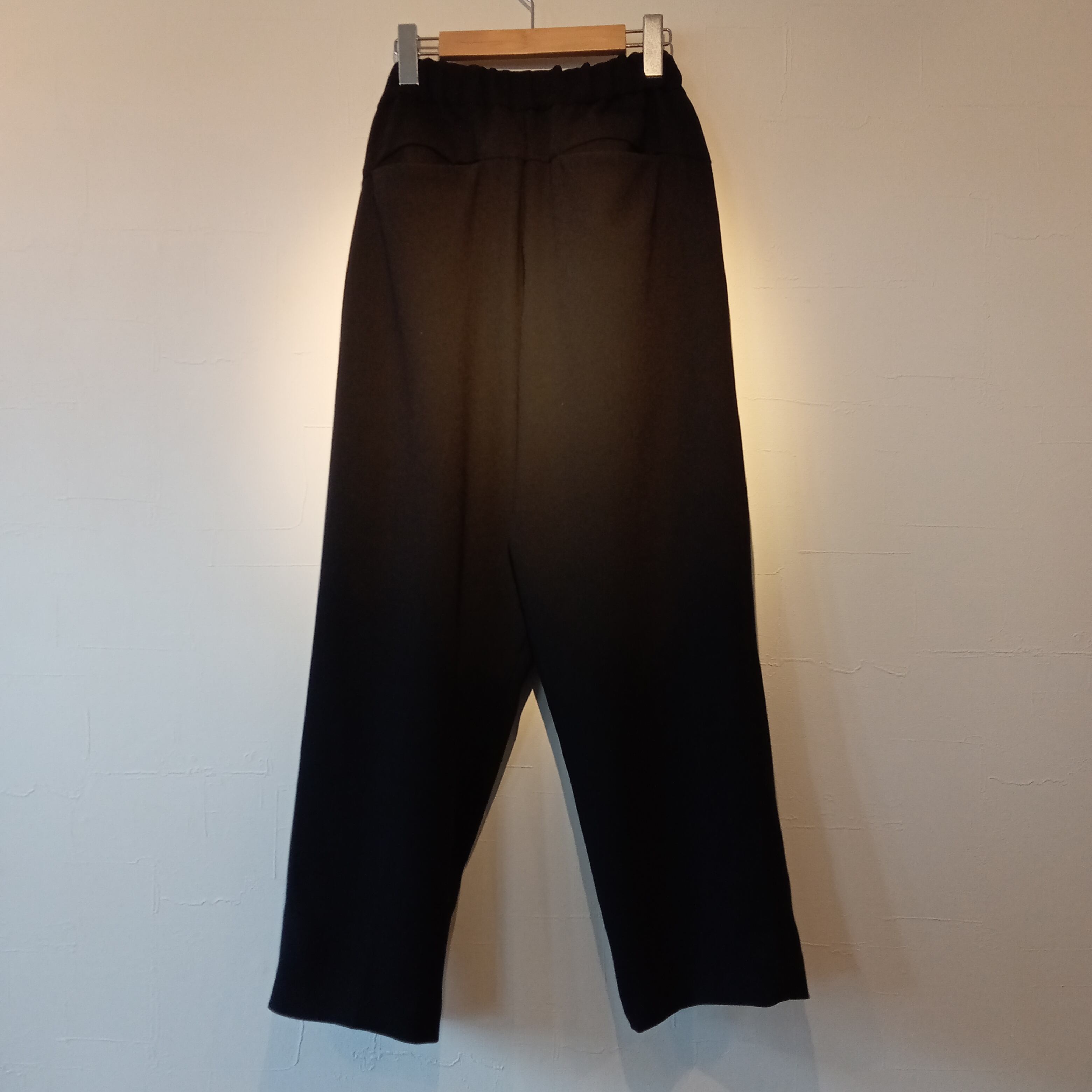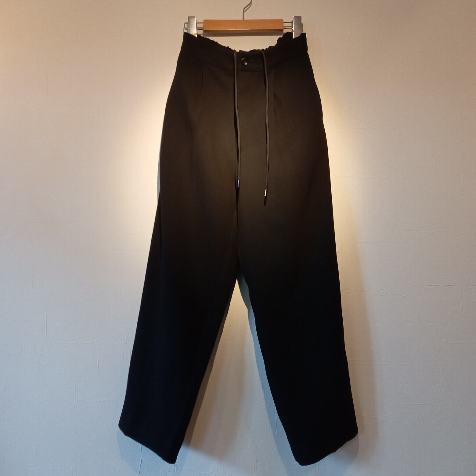 素材に上品な印象のアムンゼンを使用。生地表面に細かな凹凸があり、さらっとした軽い肌触りが特徴。また、光沢感の少ないマットな質感でしなやかなで高級感のあるドレープを生み出す。ワイドテーパードなシルエットに、ウエストゴムとスピンドル内蔵でイージーな穿き心地。クラシカルな見た目とは裏腹に、リラックス感の高いイージートラウザーズ。