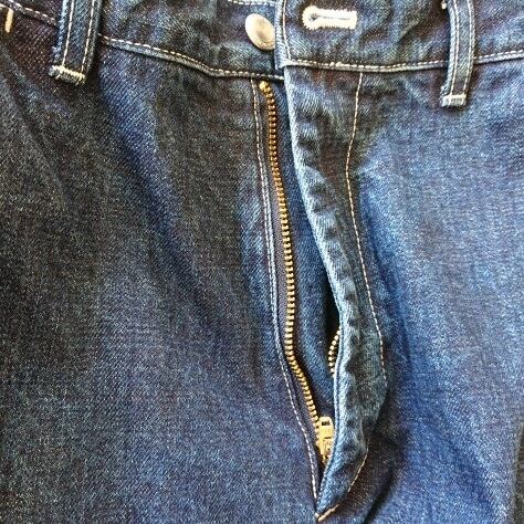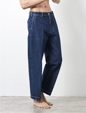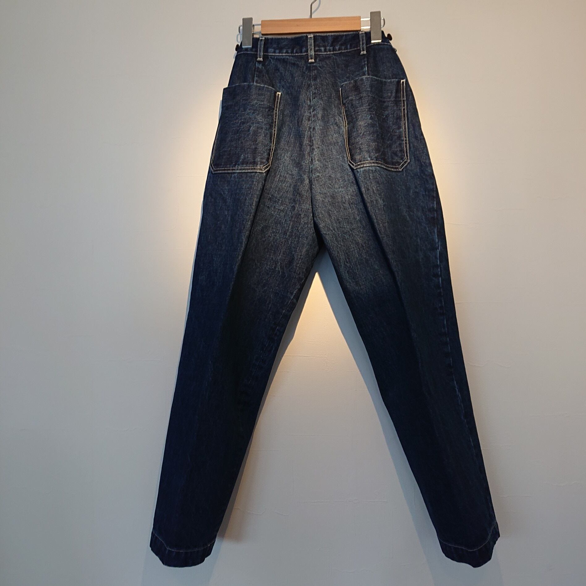 腰回りとワタリにゆとりを持たせ、裾にかけてストンと落ちる大人っぽいシルエットのトラウザーズデニム。 ベルト脇にはボタンを2つ付け、ウエスト調整可能なベルトレス仕様。