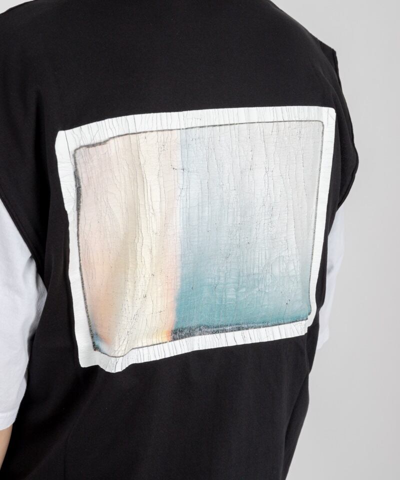 袖はカットオフ仕様で前身頃には胸ポケットを配置。ゆったりとしたシルエットのアイテムです。後ろ身頃のプリントはクラックプリント技法で油絵のような雰囲気。